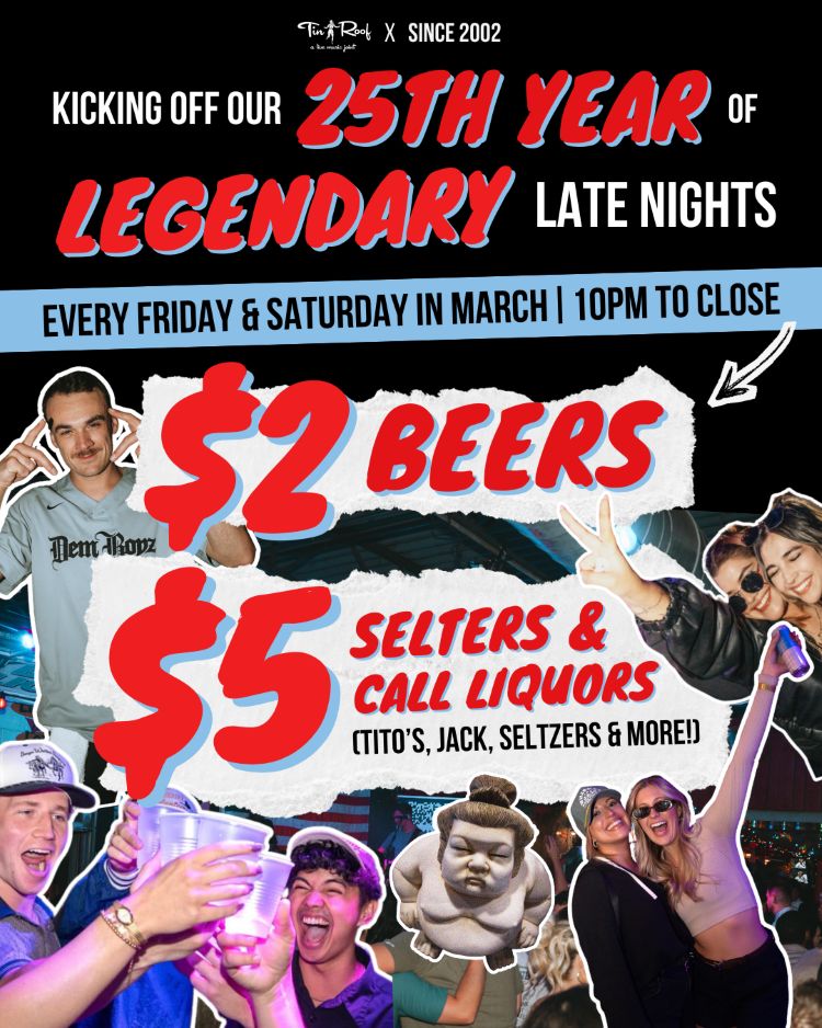 Get lucky at Tin Roof for the big Saturday party before St. Patrick's Day! ๐๐ Weโre turning the party all the way up with green beer, Irish whiskey specials, live music, DJs, and nonstop dancing all day and night. Throw on your green, grab your crew, and letโs sham-rock the house! ๐ป๐ถ