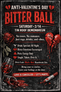 This Valentine’s Day, skip the romance and embrace the chaos at the annual Bitter Ball at Tin Roof on Demonbreun Street. Whether you’re single, taken, or just over it, Nashville’s longest running anti-Valentine’s party is all about great music, strong drinks, and zero feelings. Pull up with your crew, dance it out, and toast to being unbothered.